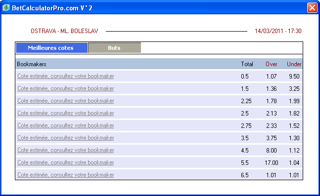 Buts : Il s’agit des paris sur le nombre total de buts marqués dans un match. BetCalculatorPro indique les cotes trouvées en rapport avec les différentes sortes de paris. Par exemple le pari le plus courant est "Plus ou moins de 2,5 buts au total", ce qui veut dire que si dans la rencontre il y a 2 buts au total, ceux qui auront parié sur moins de 2.5 buts, gagneront leur pari.